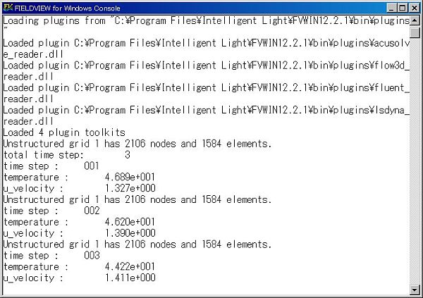 上記の手順1〜2の作業で、プロンプト画面に以下の図のような 2つの scalar 値結果が時刻進行にともなって、出力されます。