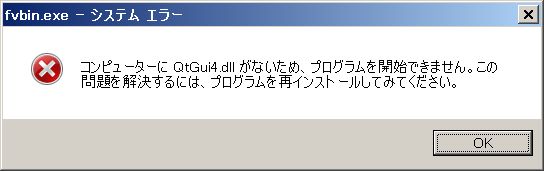 を利用するようになりました。これは、バッチファイルを起動することによって、FieldView の本起動前に必要な Qt ライブラリのパス情報などを準備するためです。そのため、 fvbin.exe を元に、デスクトップ等にショートカットを作成した場合は上記のようなエラーが表示されます。