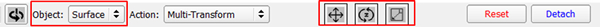 展開面は他のオブジェクトから分離(Detach)されており、ビューワツールバー上で”Object: World”の状態では展開面の移動・回転・拡大・縮小を行うことはできません。展開面をCurrentにした状態(Iso-Surfaceパネルで展開面のID選択時、あるいは展開面のダブルクリックでCurrentになります)で、”Object: Surface”に変更することで移動・回転・拡大・縮小が可能になります。
