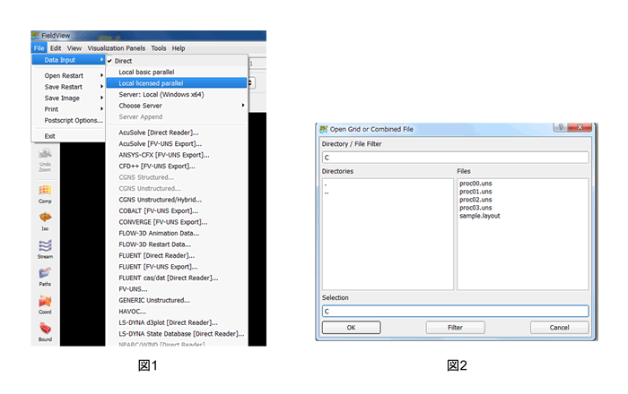 ローカルマシン上で並列可視化する場合、Local licensed parallel機能を使用します(図1)。 FieldViewの標準ライセンスで、8並列まで実行できます。より多くの並列で可視化するためには別途ライセンス(並列ライセンス)が必要です。 このオプションを選択すると、ローカルマシンで共有メモリ型のサーバプロセスが実行されます。このとき、並列数は並列ライセンス数※1かローカルマシンのCPUコア数のどちらか少ない方に制限されます。(8CPUコアしかないローカルマシンで32並列プロセスを実行しようとした際、8並列プロセスとなります)