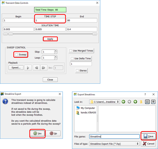 流脈線データの作成方法 Streamlinesパネル上で、非定常解析データから流脈線(Streakline)データを作成する方法、即ち、非定常な解析空間を運動する質量ゼロの粒子軌跡データを作成する手順について説明します。