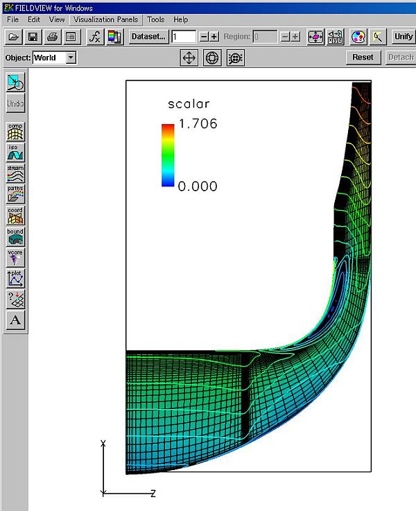 解凍した \data ディレクトリの中に 構造格子をもちいた 円筒座標モデルが配置されています。ディレクトリ内の sample.dat という Restart ファイルを読み込むことによって、以下のような図が表示されます。