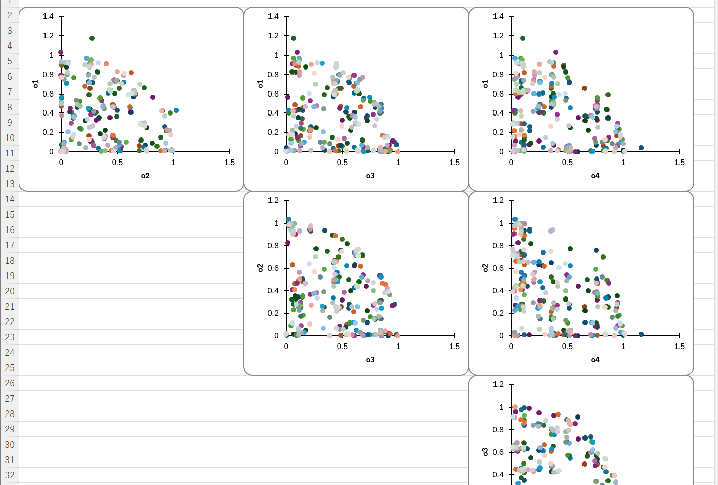 - 目的関数o1, o2はトレードオフ関係がある