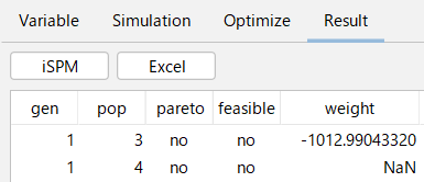 制約条件の評価式の値が 0 未満のときは feasible に "no" と表示されます。 制約条件は[Expression]で設定した評価式の計算結果が表示されます。