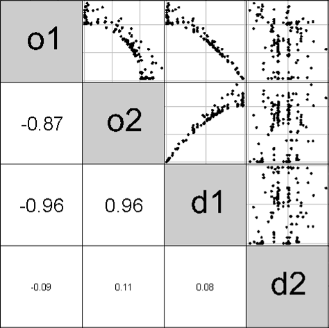 - 設計変数d1は目的関数d1に負の関係があり、目的関数d2に正の関係がある
