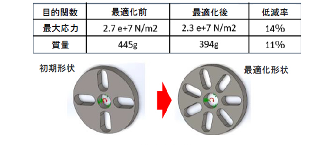 SOLIDWORKS プラグインを使用した結果、既存のワークフローを変更することなく、最大応力を14%、質量を11%低減した最適解が得られました。