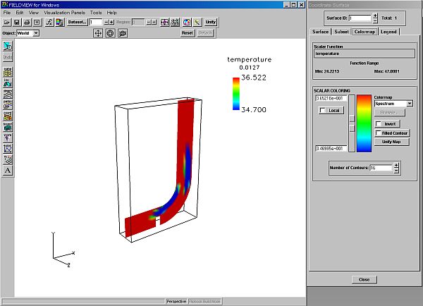 初期の設定においては、ターゲットとなる Coordinate Surface 上の Scalar 値の最大値、最小値を取得して、まず、中央値を求めます。新しい最大値、最小値を中央値を基準にして狭めている設定を行っています。その結果は上図のように Coordinate Surface パネルの [Colormap] タブを開くと、Scalar Coloring のスライドバーが移動していることにより確かめられます。