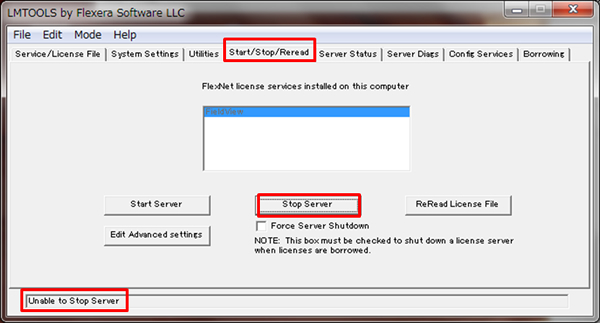 LMTOOLS ユーティリティを使用してライセンスマネージャを停止する際、ウィンドウの下部に以下のメッセージが表示され停止することができない場合があります。