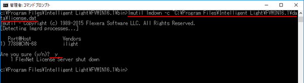 ライセンスマネージャを停止するかの確認を聞かれますので y を入力します。これによりライセンスマネージャデーモン(lmgrd.exe)とベンダーデーモン(ilight.exe)が停止します。