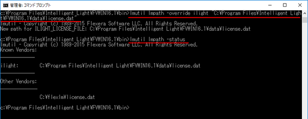 -override オプションに与える引数にはベンダー名(illight)に続けてライセンスファイルをフルパス(“C:\Program Files\Intelligent Light\FVWIN16.1\data\license.dat”)で指定します。これによりキャッシュが上書きされ、LMTOOLSからライセンスサービスの停止が行えるようになります。上記コマンド実行後、 -status オプションで設定を確認することができます。