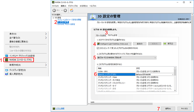 Windows OS環境において統合型グラフィックスカードとNVIDIAグラフィックスカードの両方が搭載されているマシン上で、FieldView起動時に自動的にNVIDIAグラフィックスカードが選択されない場合があります。この場合、以下の手順で明示的にNVIDIAグラフィックスカードの使用を指定することで、改善する場合があります。