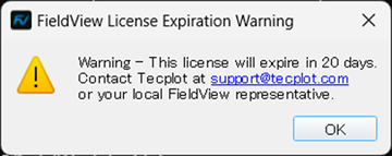 FieldViewのライセンス有効期間が30日以下になると、次のようなダイアログメッセージが表示されます。これは起動時に毎回表示され、OKをクリックすると消えます。このメッセージの表示を抑止するための方法をご案内します。