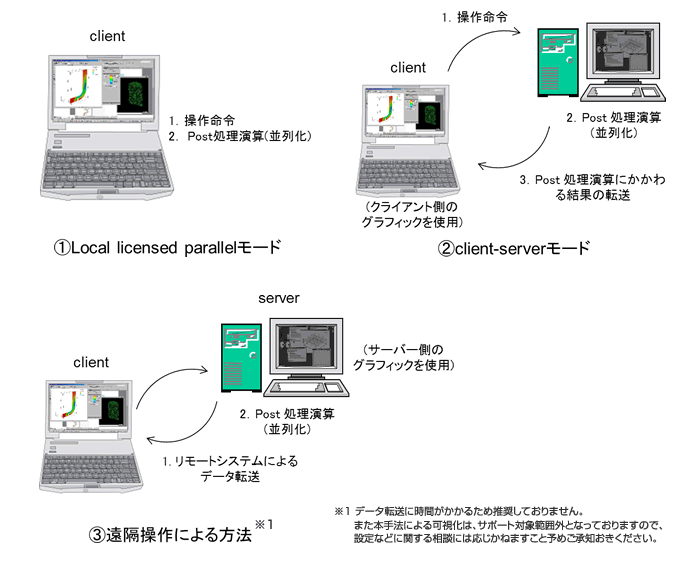FieldView では、並列化処理として以下の3つの方法があります。 ①Local licensed parallelモード(FAQ PL033) ②client-serverモード(FAQ PL011) ③遠隔操作による方法※1