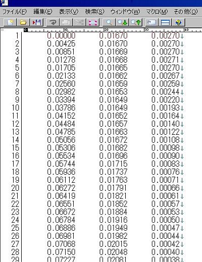 FVX を実行すると、 以下のように1粒子の各時刻における x, y, z 座標 が入った "output.dat" というファイルが生成されます。