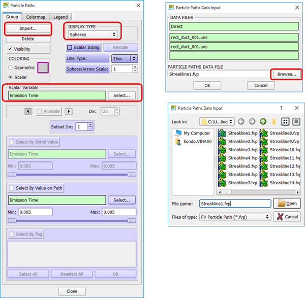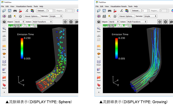 1. 環境変数 FV_SINGLE_FILE_STREAKLINES=1 の設定(流跡線の表示を行う場合) デフォルトでは流脈線データはPARTICLE SETフォーマットで保存されます。PARTICLE SETフォーマットでは、非定常Sweepを行った際に各タイムステップでの粒子軌跡データが個別のファイルに保存されます。これらのファイルには各放出粒子の軌跡の時刻歴の情報は含まれていないため、流跡線として表示を行うことはできません。流跡線として表示するためにはSTREAKLINEフォーマットで出力する必要があります。 STREAKLINEフォーマットでは非定常Sweepを行った際に各タイムステップでの粒子軌跡データは1つのファイルに連続して保存されます。 STREAKLINEフォーマットで出力したい場合は、環境変数 FV_SINGLE_FILE_STREAKLINES=1 を設定した後、FieldViewを起動して以下の作業を行ってください。