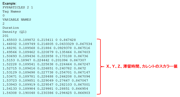 エクスポートされたデータは FieldView Particle Path format で保存され、X、Y、Z座標と滞留時間(Duration)、カレントのスカラー値のデータ列で構成されます。以下にエクスポートされたデータサンプルを示します。